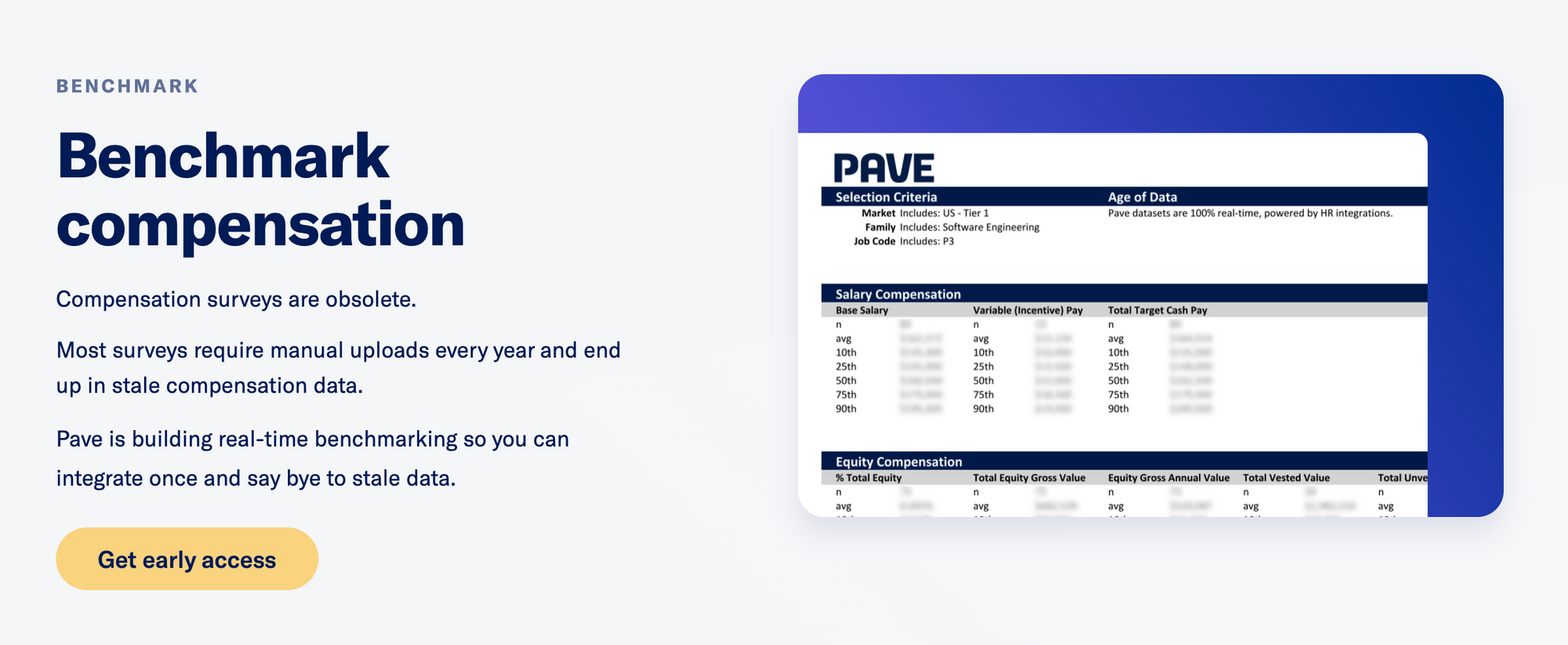 "Plan, communicate, and benchmark your compensation in real-time. Pave allows you to make smarter comp decisions and eliminate spreadsheets, powered by real-time integrations with your HRIS, ATS, and Cap Table."
