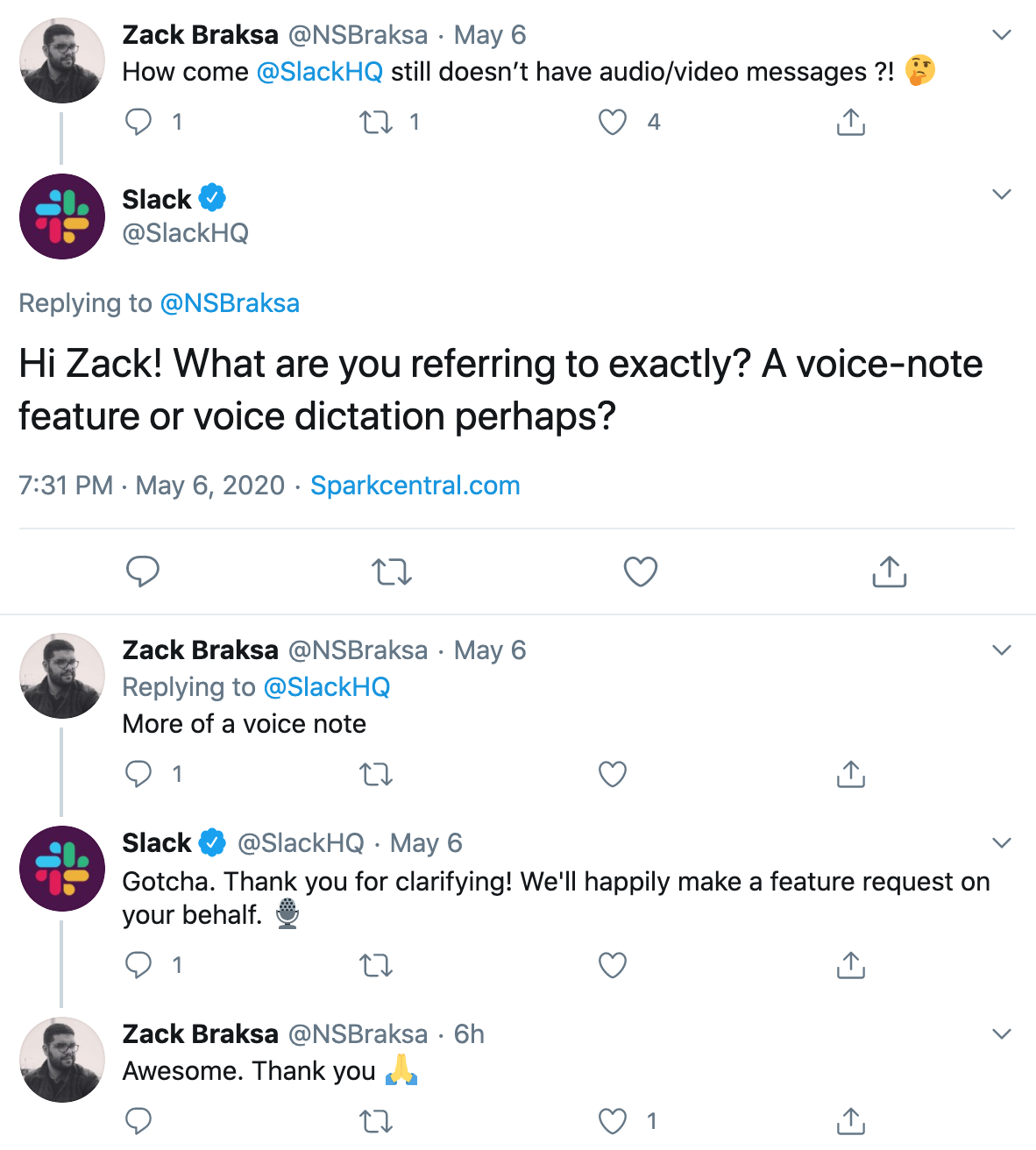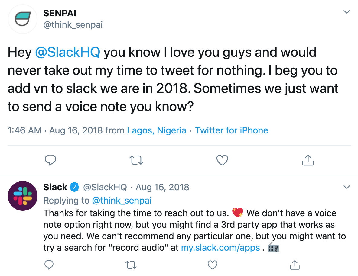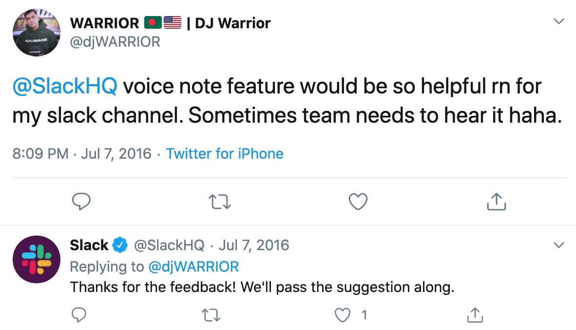 And because there’s no native Slack solution, the demand for a seamless voice messaging experience has helped us at Yac. In fact, we found one of our investors through a tweet about sending Slack voice messages with variable controls!