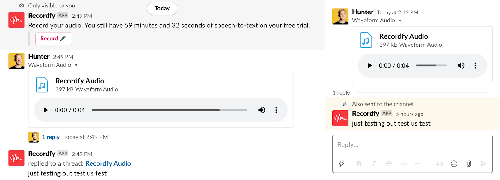 The listening experience in Slack is not optimal either. To bridge the design gaps, teams like Recordfy include a transcription alongside the recording file shown in the sidebar above.
