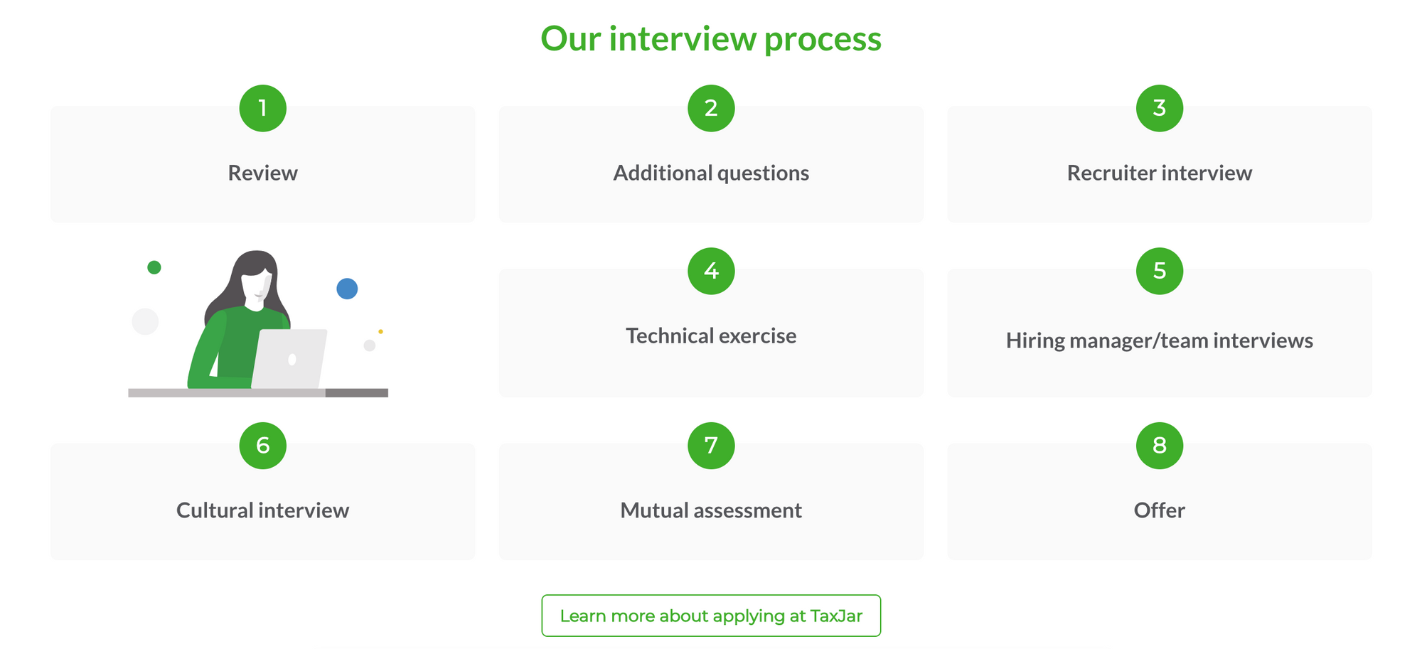 See below how the TaxJar beautifully laid-out their 8-step interview process, backed-up by an article answering candidates questions.