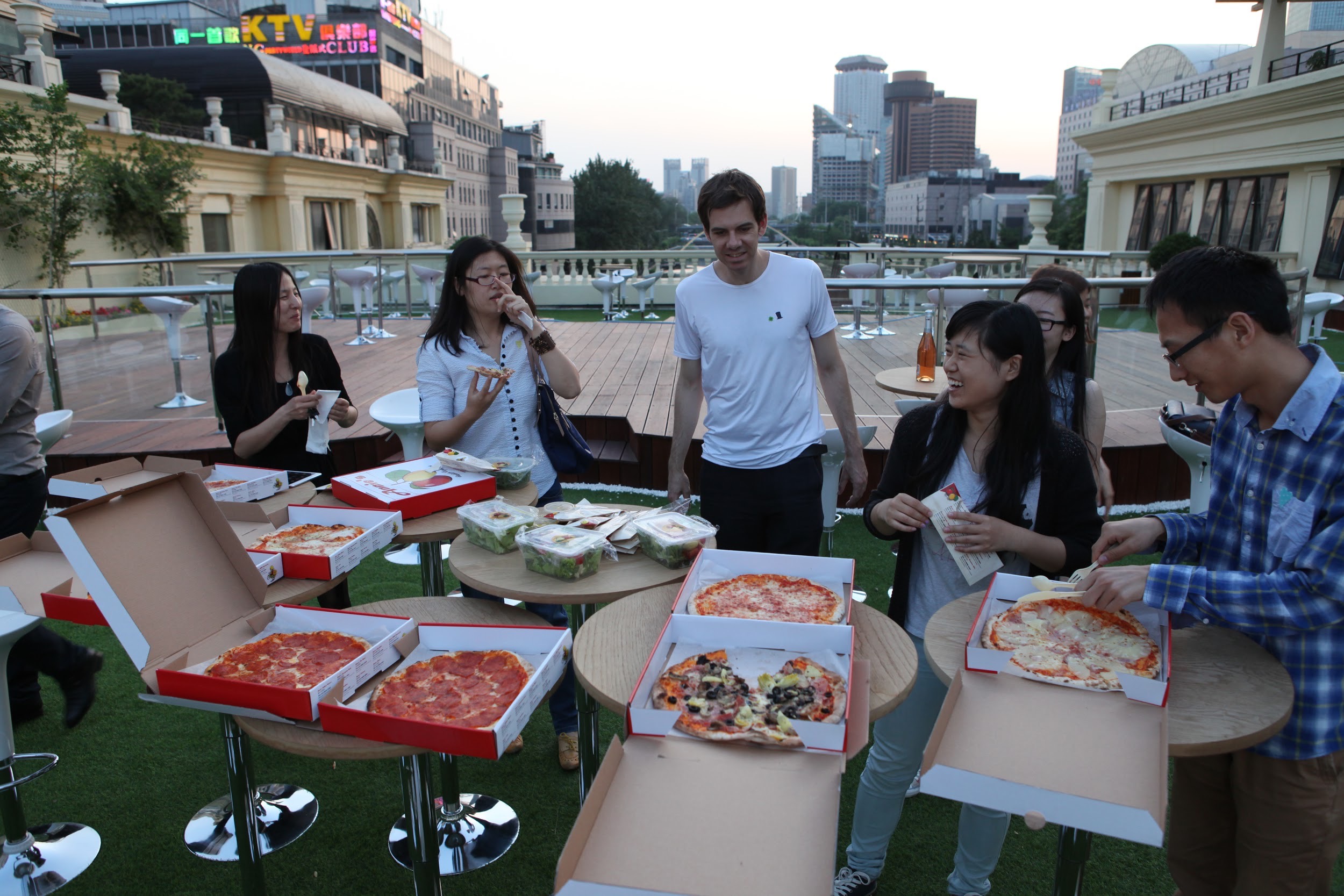 A beautiful view of the city skyline and river below, the sunlight reflecting off nearby glitzy skyscrapers and free pizza and beer has everyone at ease. It’s a comfortable setting to exchange ideas and fire off questions at each other.